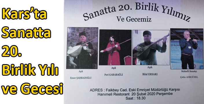 Karslı halk ozanları Bilal Ersarı, Ensar Şahbazoğlu, mahalli sanatçılar Çetin Adıgüzel ve Azerbaycanlı sanatçı aşık Peri Garabağlı “Sanatta 20. Birlik ve Gecesi” düzenliyor.