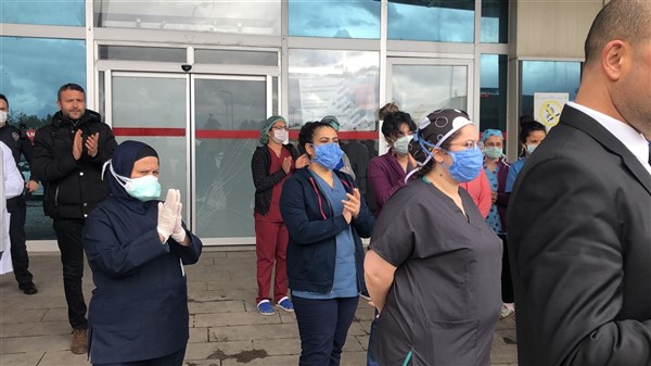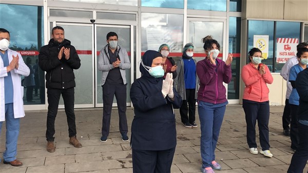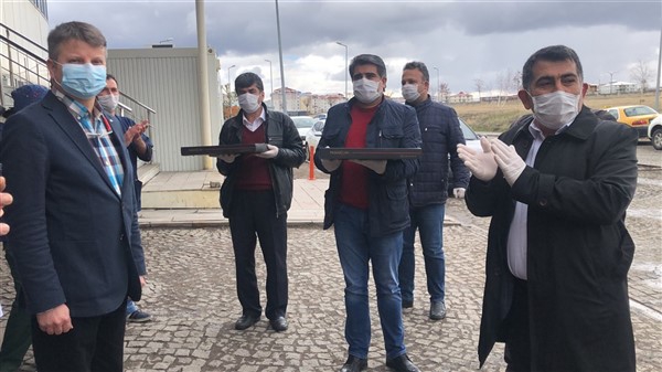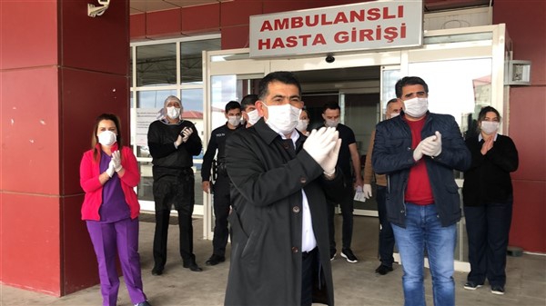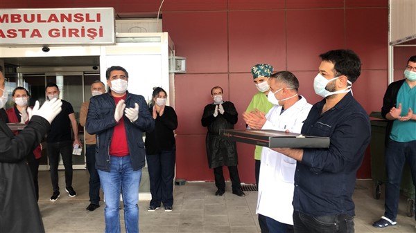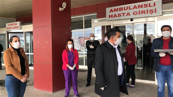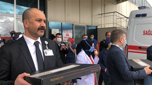 Toraman ve TCDD çalışanları sağlık personellerini bir süre alkışladıktan sonra tatlı ikramında bulundular.