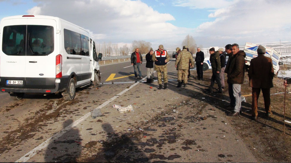 Kars Erzurum Karayolu Kümbetli Köyü kavşağında meydana gelen trafik kazasında Kars istikametinde seyir halinde olan Mecit İşçi idaresindeki 44 BE 594 plakalı kamyonet ile tali yoldan ana yola çıkan Yusuf Ertaş idaresindeki 36 AH 335 plakalı yolcu minibüsü kavşakta kafa kafaya çarpıştı. Meydana gelen trafik kazasında araçlarda maddi hasar oluşurken, araçlara ait parçalar karayoluna savruldu.