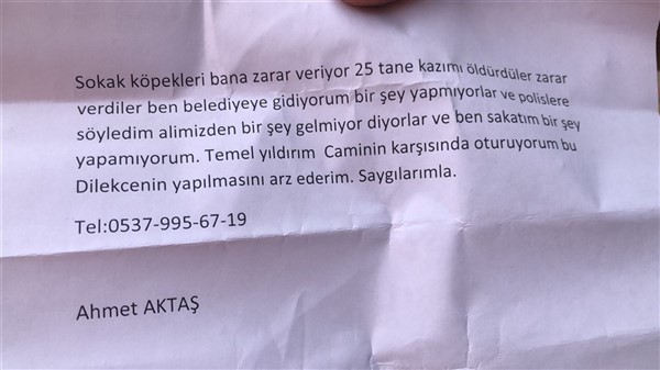 Ne yapacağını şaşıran Aktaş, tamamen çaresiz kaldığını söyleyerek, devlet kurumlarından ve duyarlı vatandaşlardan yardım talebinde bulundu. Aktaş, “Ben bu kazları platinin plastiği için saklıyordum. Onları satıp plastiği değiştirecektim. Bacağımdaki plastik her yıl yenilenmesi gerekiyor. Umutlarımı bu kazlara bağlamıştım ama sokak köpeklerini hepsini öldürmüşler. Dün akşam saat 18.00 sıralarında eve geldiğimde baktım köpekler boğmuş. Bütün gelirimi bunlarla sağlıyordum. Şu anda çok zor durumdayım. Sayın valimizden yardım istiyorum. Devletimiz bana yardım etsin. Bugün bu köpekler malıma zarar verdi yarın da bana zarar verirler.” dedi.