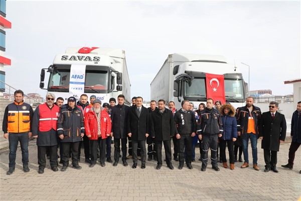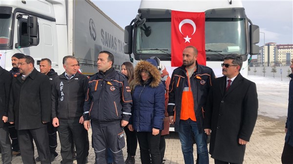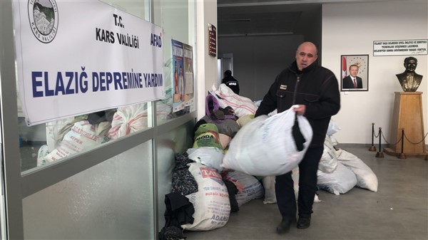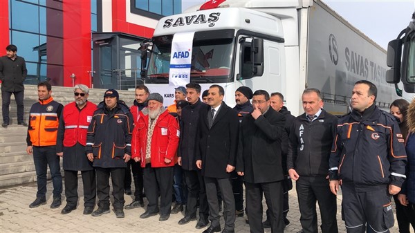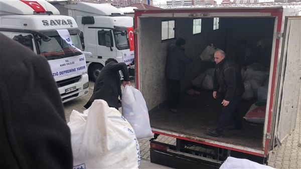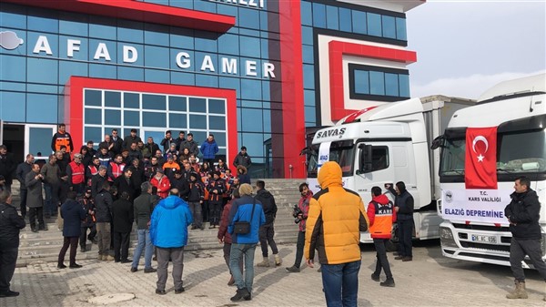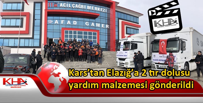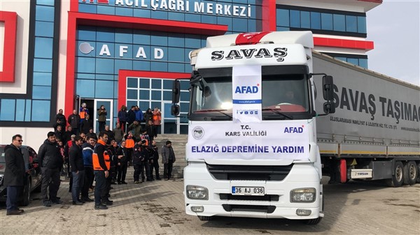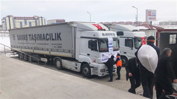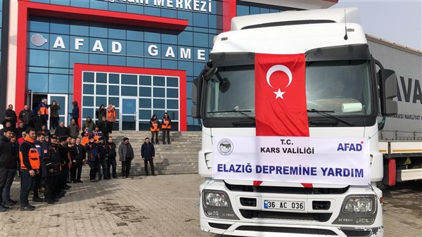 Elazığ’da yaşanan 6,8 şiddetindeki depremin ardından Türkiye genelinde başlatılan yardım kampanyası kapsamında Kars Valiliği öncülüğünde Kars genelinde kamu kurum ve kuruluşlarının, STK'ların ve vatandaşların desteğiyle toplanan 2 tır yardım malzemesi Vali Türker Öksüz’ün katılımıyla Elazığ’a gönderildi. KATSO Başkanı Ertuğrul Alibeyoğlu, AFAD Müdürü Oktay Ayğan, Müftü Yusuf Eviş, Kızılay Şubesi Başkanı Sıddık Demir’in de hazır bulunduğu törende dualar edildikten sonra tırlar yola çıktı.