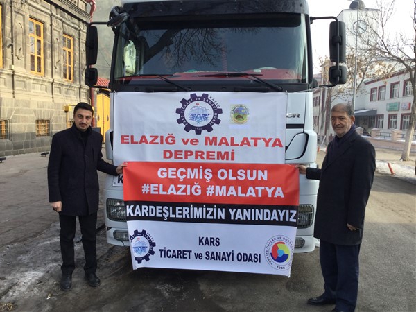 Kars Ticaret ve Sanayi Odası organizasyonu ve Kars Ticaret Borsası katkıları ile Elazığ ve Malatya'daki depremzedeler için toplanan yardımlar, depremzede vatandaşlarımıza ulaştırılmak üzere yola çıktı. Toplanan yardımlar araçlara yüklenerek TOBB ve AFAD eşgüdümünde Elazığ ve Malatya'da depremden zarar gören vatandaşlara ulaştırılacak.