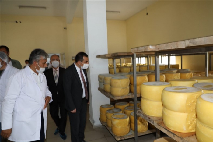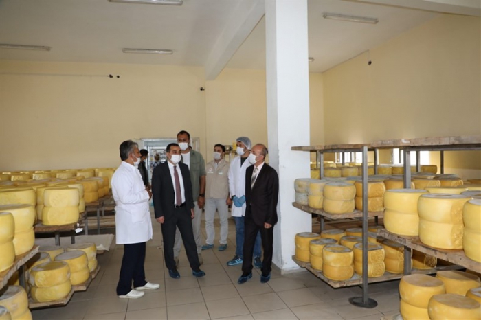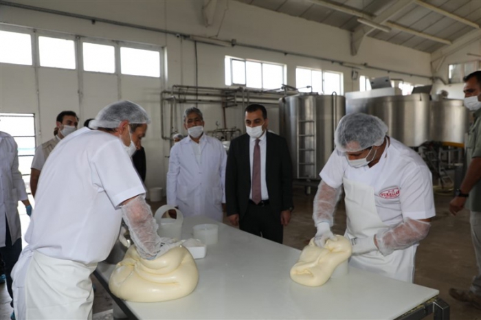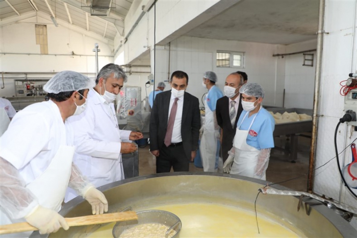 İşletmede incelemelerde bulunan Vali Öksüz, firmanın faaliyetleri ve kaşar peynirinin üretim aşamaları hakkında yetkililerden bilgi aldı
