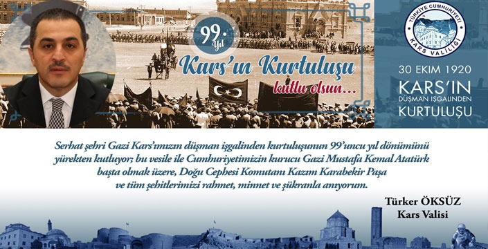 Vali Öksüz, “30 Ekim Serhat Şehri Kars’ımızın düşman işgalinden kurtuluşunun 99’uncu yıldönümünü yürekten kutluyor, bu vesile ile cumhuriyetimizin kurucusu Gazi Mustafa Kemal Atatürk başta olmak üzere, Doğu Cephesi Komutanı Kazım Karabekir Paşa ve tüm şehitlerimizi rahmet, minnet ve şükranla anıyorum” dedi..