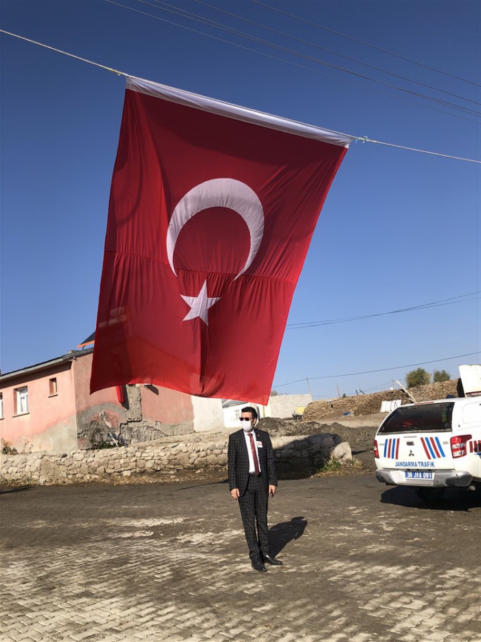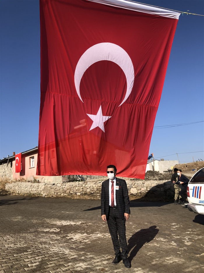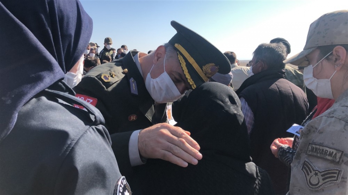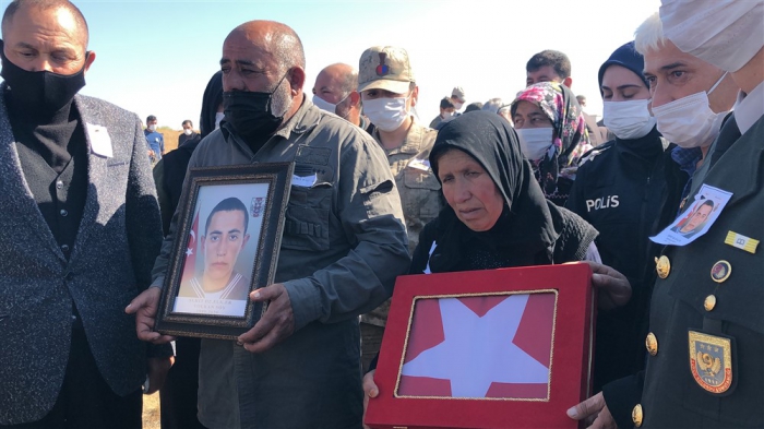 Kars Valisi Türker Öksüz, tabuta sarılı Türk Bayrağı özenle katlandıktan sonra şehit Volkan Soy'un fotoğrafını baba Erhan Soy'a teslim etti.