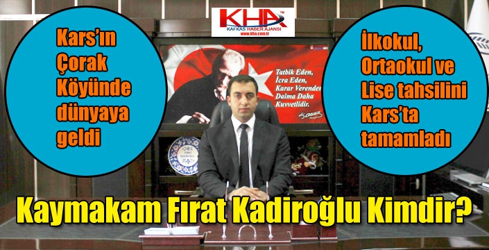 1995 yılında Kars merkeze bağlı Çorak Köyünde dünyaya gelen Kaymakam Fırat KADİROĞLU İlkokul, Ortaokul ve Lise tahsilini Kars’ta tamamladı. 2017 yılında Dokuz Eylül Üniversitesi Kamu Yönetimi Bölümünden mezun oldu. 2018 yılında İçişleri Bakanlığı tarafından yapılan Kaymakamlık Sınavına girerek başarılı olup Mülki İdare Amirliği mesleğine intisap etmiştir. Antalya Kaymakam Adayı olarak göreve başlayan KADİROĞLU Diyarbakır Ergani ve Samsun Havza ilçelerinde Refiklik Stajını tamamladı.