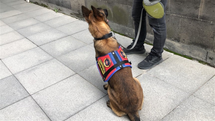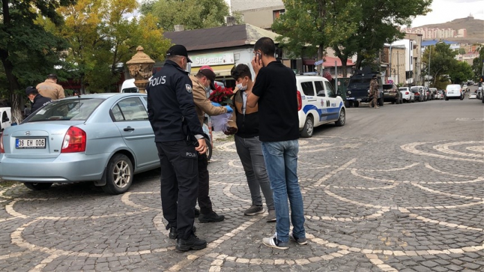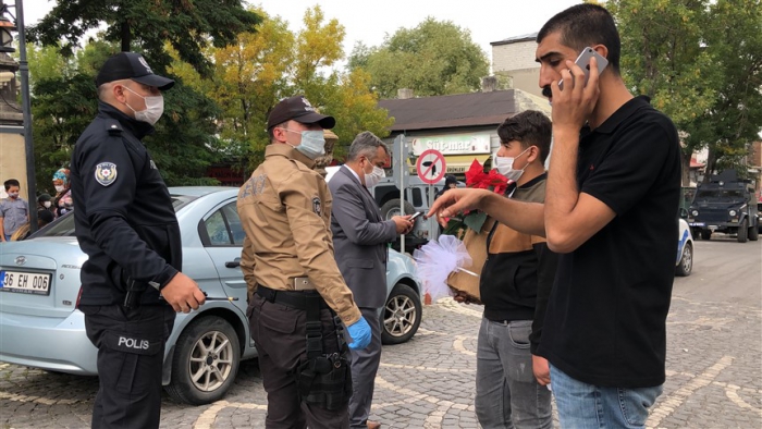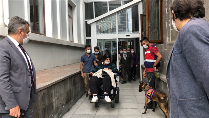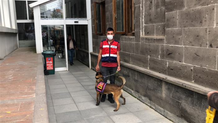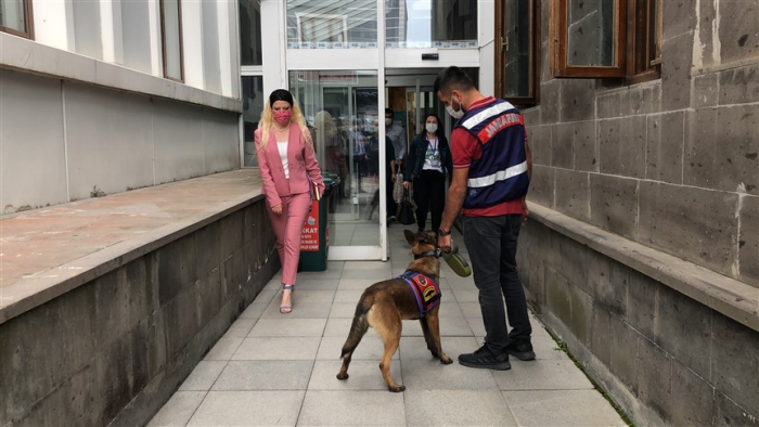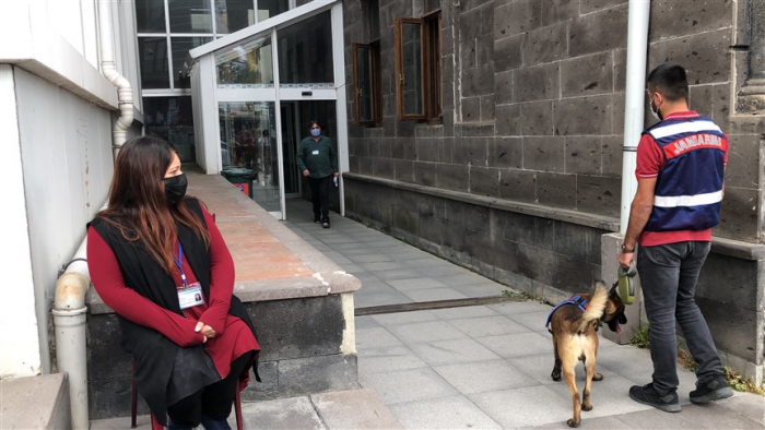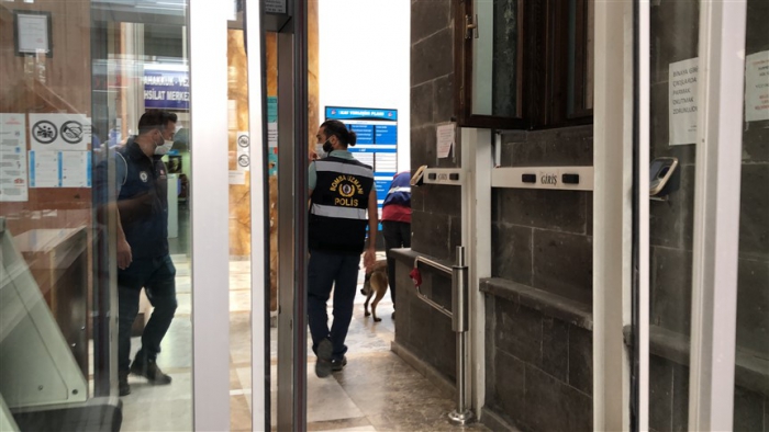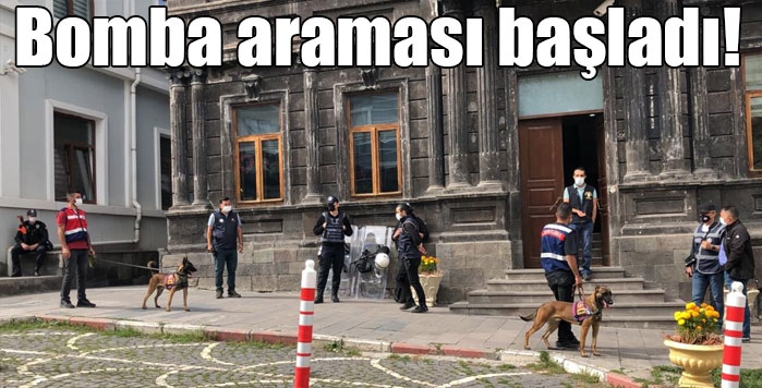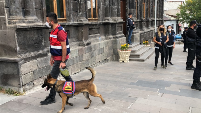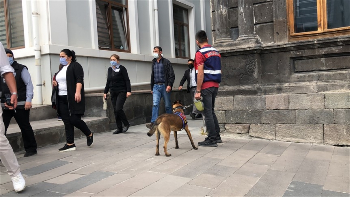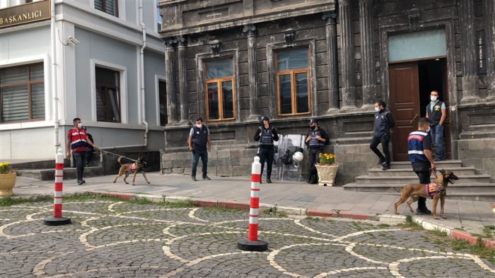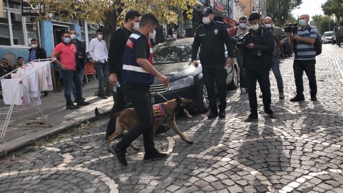 Bölgede geniş güvenlik önlemleri alan polis ekipleri, İl Jandarma Komutanlığında görevli bomba arama köpeği “çapkın” ve “taş” isimli köpeklerle bomba araması başlattı.