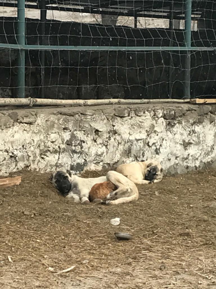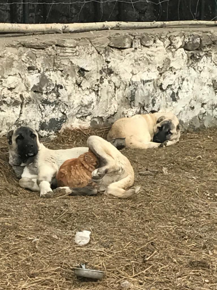 Muhtar Demirkaya, “Ahırın önüne gittiğimde baktım mi kedi köpeğin karnında ısınıyor. Bizler genelde köpeklerin kedilere saldırdığını biliyorduk. Ama bu görüntü son derece mükemmeldi. Kedi ve köpeğin birlikte paylaştıkları soğuk havada birlikte ısınması bizleri duygulandırdı.” dedi.