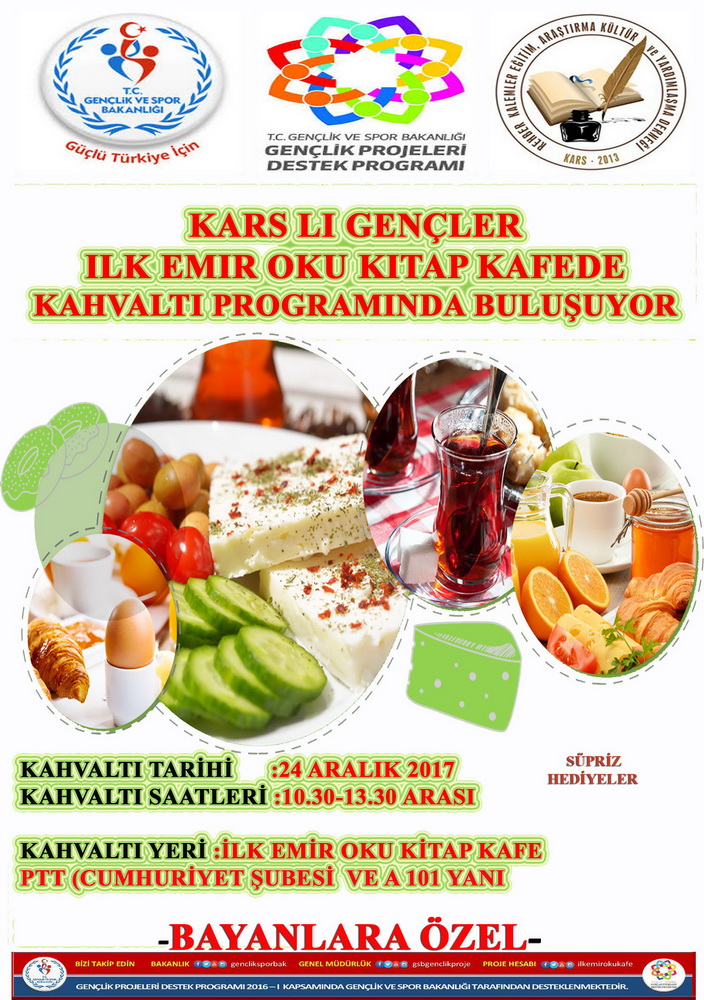 Proje koordinatörü Hüsnü ÇELİK, 24 Aralık 2017 Pazar günü bayan kardeşlerimize özel bir sabah kahvaltısı buluşması planladık. Davetimize icabet eden Karslı gençlerimiz ve misafir gençlerimize çeşitli ikramlar yanında sürpriz hediyeler da sunacağız. Bu kahvaltı sayesinde gençlerimiz arasında kaynaşma tanışma olacağı gibi kitap kafemize devamlılıkları sağlanmış olacak. Dedi.
