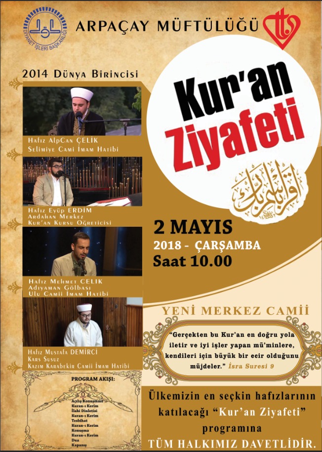 Kars Arpaçay İlçe Müftülü tarafından 2 Mayıs 2018 çarşamba günü saat: 10.00’da Yeni Camii’nde Kur’an Ziyafeti düzenlenecek.