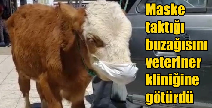 Yeni tip koronavirüs (Kovid-19) tedbirleri kapsamında alınan kurallara uyan duyarlı bir vatandaş veteriner kliniğine götürdüğü buzağısına da maske taktı.
