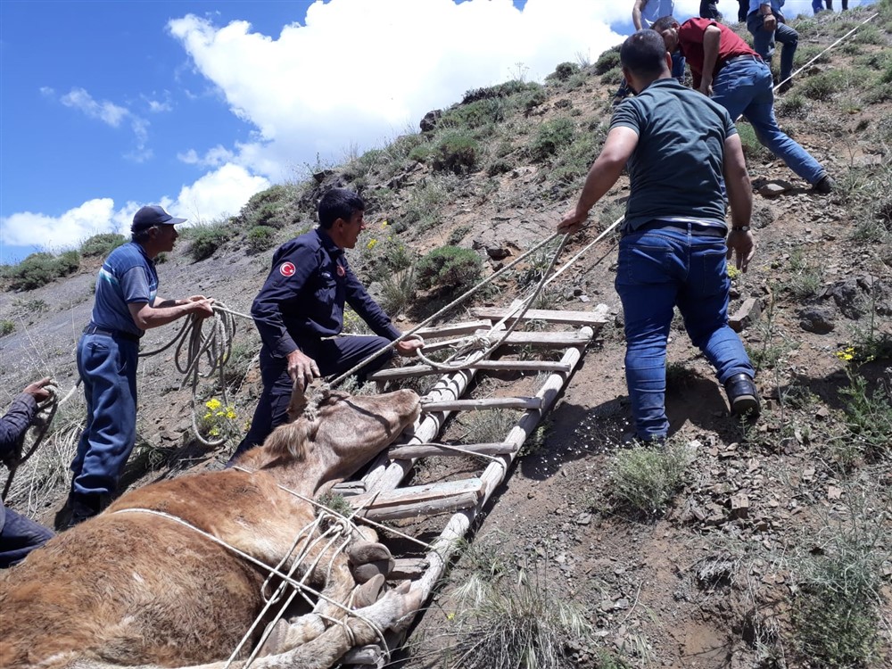 Erzurum'un Narman ilçesinde, 300 metre yükseklikten dereye düşen inek, merdivenden yapılan sedye ile 2,5 saatte kurtarıldı.
