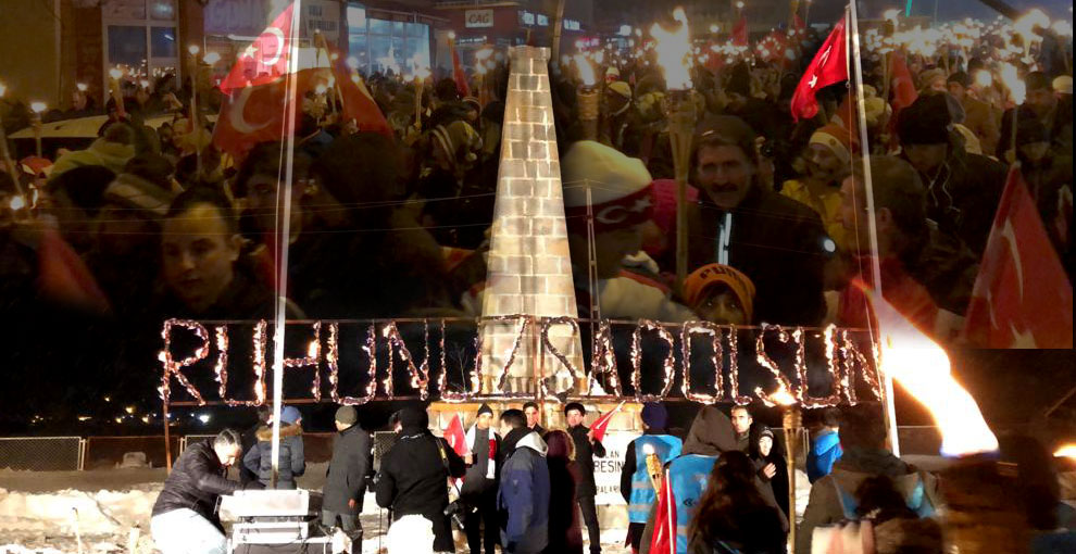 Şehitler Anıtı önüne kadar ellerinde meşalelerle yürüyen kalabalık grup burada şehitler anısına saygı duruşunda bulunarak İstiklal Marşı’nı okudu. Duaların okunması ve ecdadın yad edilmesi sonrasında meşalelerden oluşturulan “Ruhunuz Şad Olsun” yazısı ateşlenerek, bugünkü program sona erdirildi.