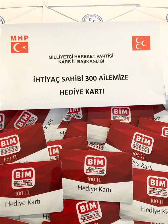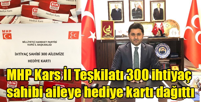 MHP Kars İl Başkanı Tolga Adıgüzel, il teşkilatı 300 ihtiyaç sahibi aileye hediye kartı dağıttıklarını açıkladı.