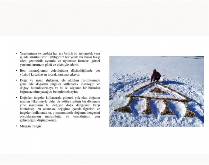 Müjgan Cengiz resim çalışmalarının yanı sıra Natural art çalışmalarda yapıyor. Doğa ile bir arada olup doğada ki nesneleri resim kavramıyla harmanlamayı hedefliyor. Bunu yaparken de doğu kültüründen motifler kullanıyor.