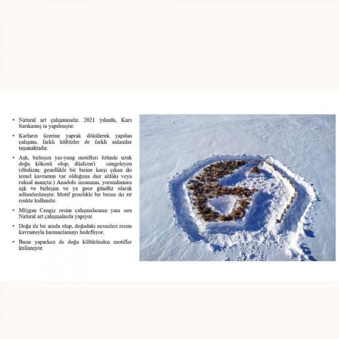 Karların üzerine yaprak dökülerek yapılan çalışma, farklı kültürler de farklı anlamlar taşımaktadır. Aşk, birleşim yın-yang motifleri özünde uzak doğu kökenli olup, dualizm’i simgeleyen (düalizm: genellikle birbirine karşı çıkan iki temel kavramın var olduğuna dair ahlakı veya ruhsal inançtır.)