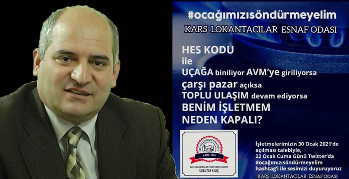 Kars Lokantacılar Odası Başkanı Subutay Kılıç sosyal medya hesabından paylaştığı çağrı ile “HES kodu ile uçağa biniliyor, AVM ye giriliyorsa, çarşı pazar açıksa, toplum ulaşım devam ediyorsa benim işletmem neden kapalı?” dedi.