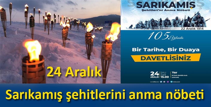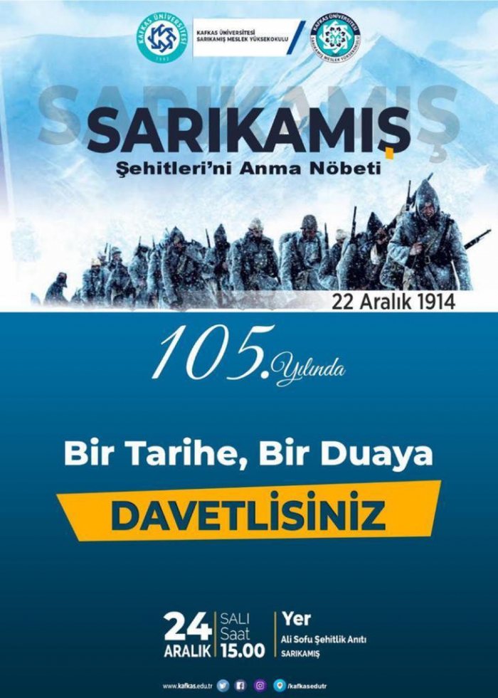 Sarıkamış Harekatı'nın 105'inci yılı anma etkinlikleri kapsamında, Kafkas Üniversitesi (KAÜ) Sarıkamış Beden Eğitimi ve Spor Yüksek Okulu ile Meslek Yüksekokulu öğrencileri, şehitler için 24 Aralık’ta Sarıkamış Alisofu Şehitlit Anıtı’nda temsili nöbet tutacak.