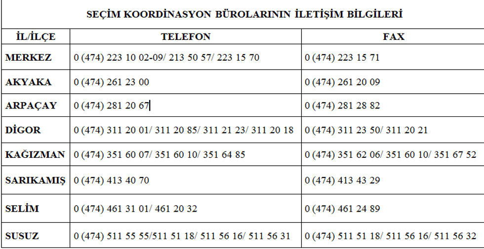 Seçim Koordinasyon Merkezlerinin iletişim bilgileri