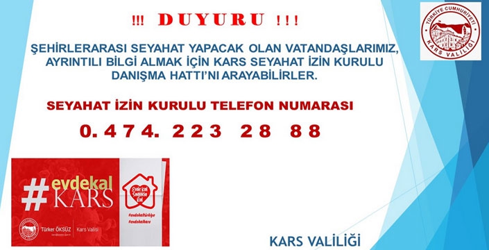 Kars Valiliği, şehirlerarası seyahat yapacak olan vatandaşlar, ayrıntılı bilgi almak için Kars Seyahat İzin Kurulu danışma hattı iletim numarasını kamuoyuyla paylaştı.