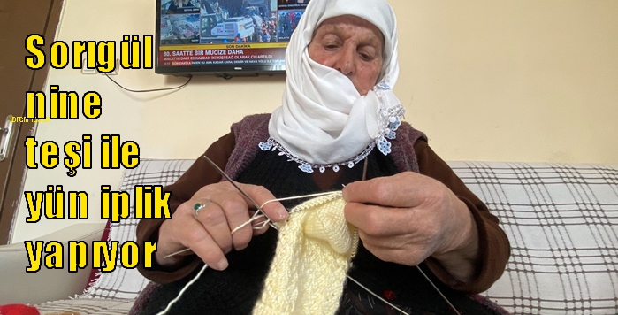 Sarıgül nine yün tarafından geçirdiği yünü yuvarlayıp avucuna sarıyor. Diğer eliyle de ipin sarılacağı teşiyi dizine sürterek çeviriyor. Teşi döndükçe yün kıvrılarak ipliğe dönüyor.