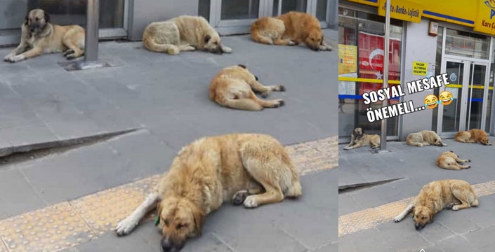 Kars’ta koronavirüs tedbirleri kapsamında araç trafiğine katılan Kazımpaşa Caddesi üzerindeki PTT Şubesi’nin önü boş kalınca sokak köpekleri güneşli havanın tadını uyuyarak çıkardılar.