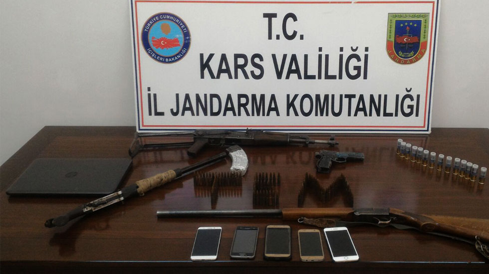 PKK/PYD/YPG bölücü terör örgütü ve mensuplarını övücü paylaşımlarda bulunan kişilere yönelik yapılan operasyonda 11 şahıs gözaltına alındı. Gözaltına alınan ev ve iş yerlerinde yapılan aramada, 1 kaleşnikof marka silah, şarjör, 113 kalaşnikof fişeği, 3 av tüfeği, 12 fişek, 1 tabanca, 9 cep telefonu, 3 tablet, 8 flaş bellek, çeşitli miktar ve adetlerde örgütsel bez parçaları, anahtarlık, CD/DVD/ kaset, resim, kartpostal, not defteri ve kitap bulundu. Zanlıların Kars İl Jandarma Komutanlığı’ndaki sorgularının sürdüğü öğrenildi.