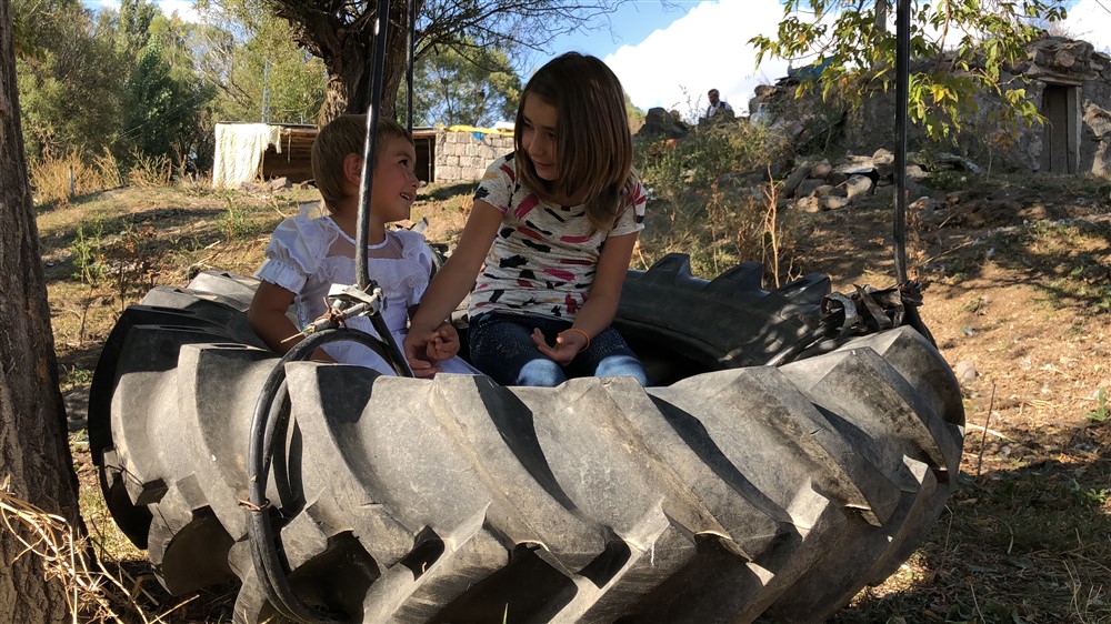 Kars’ın Akyaka ilçesine bağlı Küçük Durduran Köyü’nde park olmaması çocukları farklı alternatiflere yöneltti. Mustafa Özmen de çocuklarının eğlenmesi için traktörün dev arka lastiğinden salıncak yaptı. Özmen’in 6 ve 10 yaşındaki kızları ağaca bağlanan bu