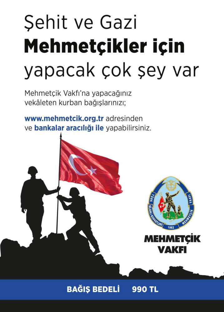 Ayrıca; TSK Mehmetçik Vakfı’nın, vatandaşlarımızın kendi irade ve arzuları ile yaptıkları vekâleten kurban bağışlarını kabul ettiğini, başka kişi, kurum veya kuruluşlara Mehmetçik Vakfı adına vekâleten kurban bağışı toplama yetkisi vermediğini bilgilerinize sunarım.”
