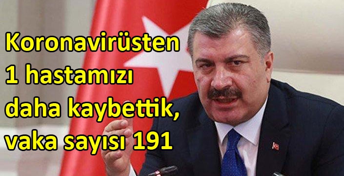Sağlık Bakanı Fahrettin Koca, Twitter hesabından yaptığı açıklamada, "61 yaşında erkek bir hastamızı kaybettik. Kendisine Allah'tan rahmet diliyorum. Bugün sonuçlanan testler, tedbirlerin çok zorunlu olduğunu gösteriyor. Tanı konup tedavilerine başlanan 93 yeni vakamız var. Hasta sayımız 191'e ulaştı. Riskin önünü birlikte keselim" ifadelerini kullandı.