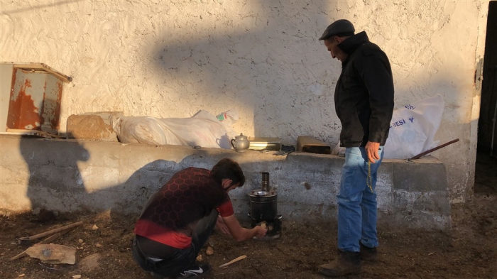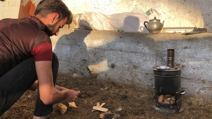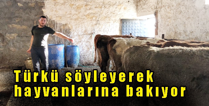Türkü söyleyerek hayvanlarına bakıyor