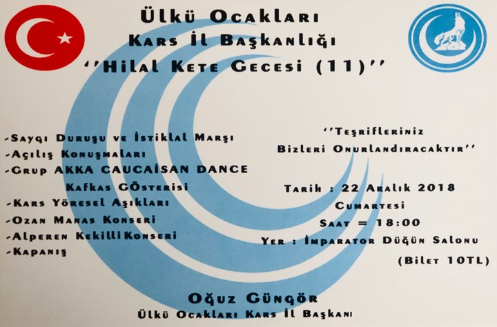 Kars Ülkü Ocaklarının 11. Geleneksel Hilal Kete Gecesi, MHP Kars Belediye Başkan Adayı Çetin Nazik’in de katılımıyla 22 Aralık Cumartesi Günü saat: 18.00’de İmparator Düğün Salonu’nda icra edilecek.