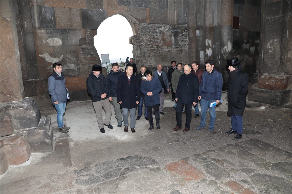 Daha sonra Ani Ören Yerindeki tarihi eserleri gezen Vali Öksüz, yapılacak yürüyüş yolları, restorasyon çalışmaları devam eden Ebu Menücehr Camii, Büyük Katedral ve Tigran Honents Kilisesi ile ilgili olarak yetkililerden bilgi aldı.