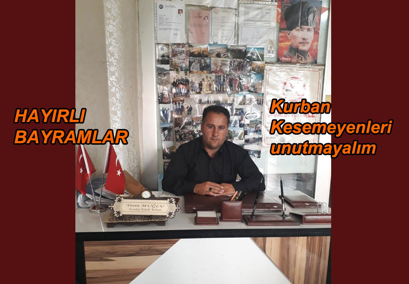 Muğlu ayrıca, “Karadağ Mahalle sakinleri, kurban bayramınızı kutlar sevgi ve saygılarımı sunarım. Kurban paylaşmaktır. Kurban kesemeyen komşularımıza kurbanımızı paylaşalım. Bayramlarımız birlik beraberlik günümüzdür. Bayramı yüce ALLAH’ın emrettiği şekilde geçirmemiz için anlamanı uygun hareket etmeliyiz ve kurban kesemeyenleri unutmamalıyız” ifadelerine yer verdi.