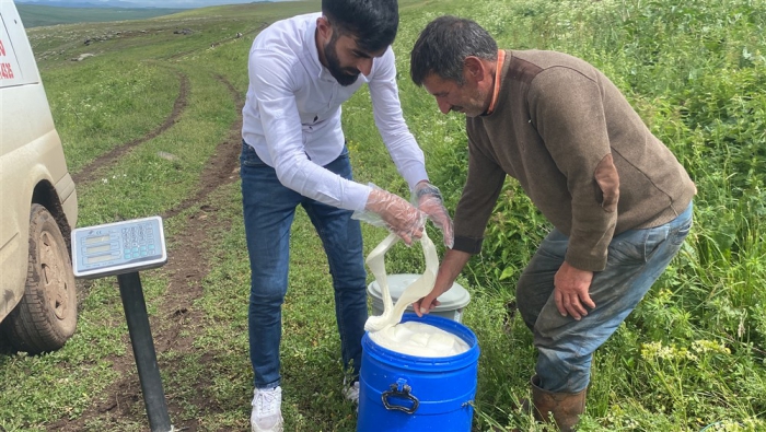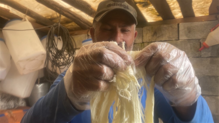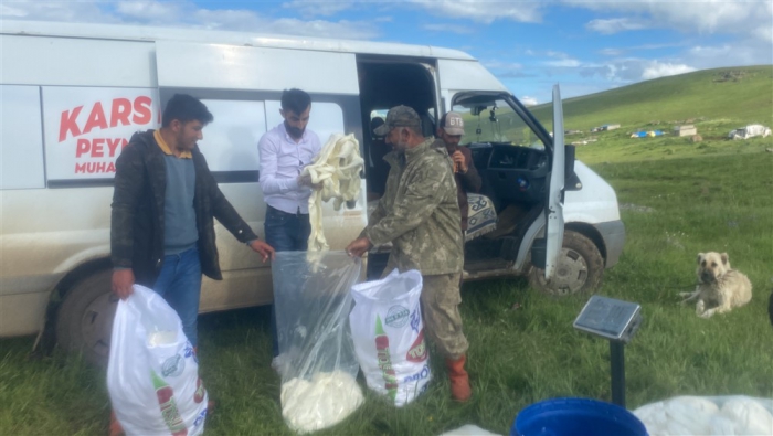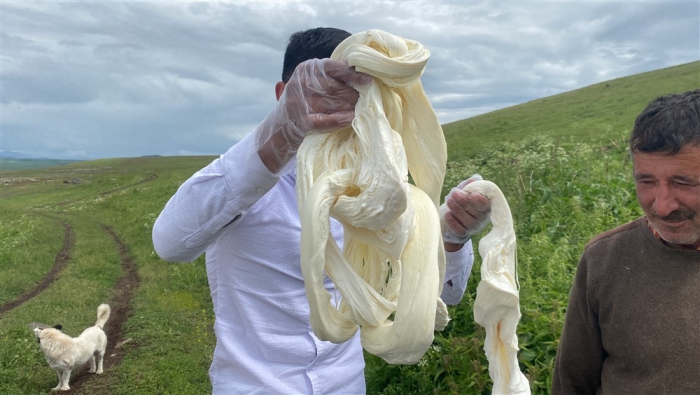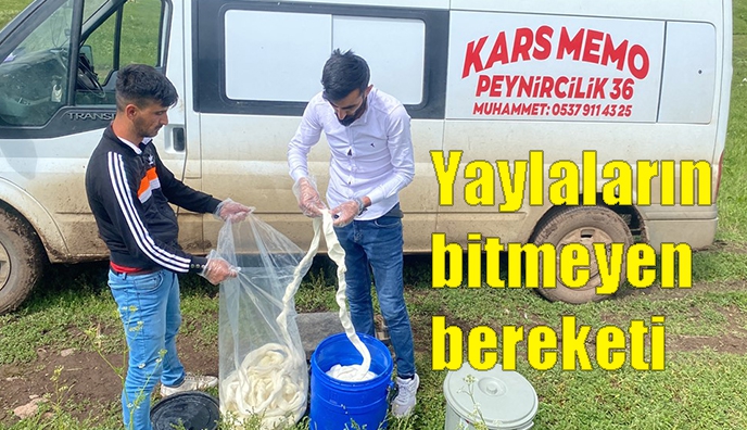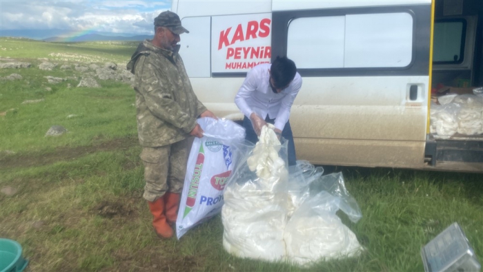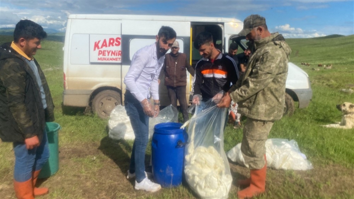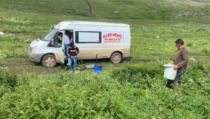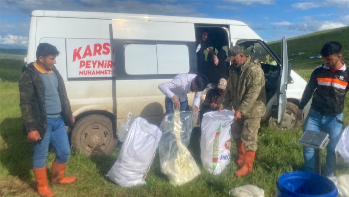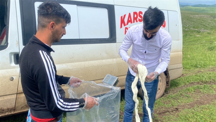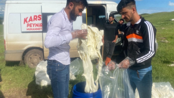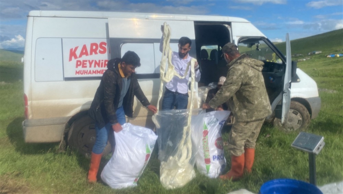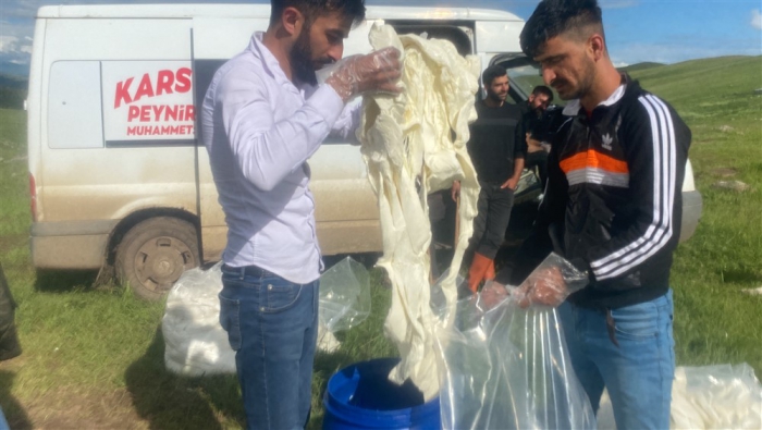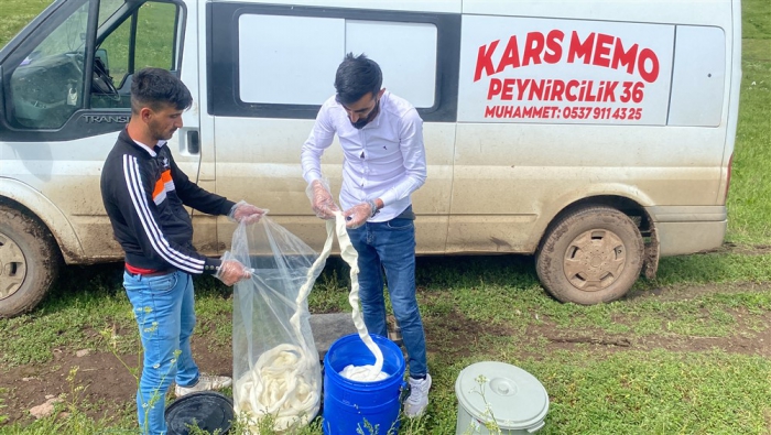 Kars’ta yüksek rakımdaki yaylalarda peynir üretimlerine başlandı. Alcılar müşterilerine organik taze çeçil peyniri temin etmek için yayla yayla gezerek ürün topluyor.